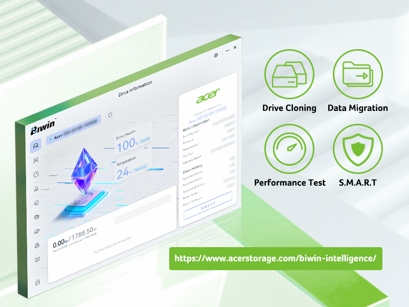 Biwin Intelligence, Acer markalı depolama ürünlerini desteklemek üzere tasarlanmış çok işlevli bir yönetim yazılımıdır. Daha rahat ve güvenli bir depolama deneyimi için bu yazılım, kullanıcıların performans testi, veri aktarımı, sürücü klonlama ve daha fazlası gibi özelliklerle sürücülerini yönetmelerine yardımcı olur.